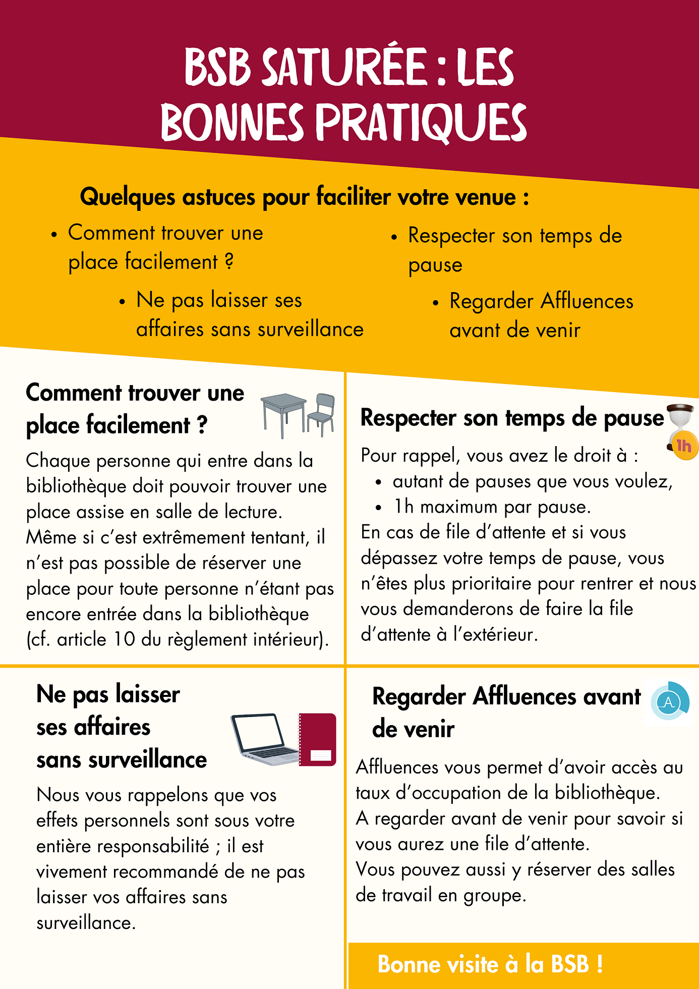 Vous êtes nombreux et nombreuses chaque jour à venir à la BSB. Voici quelques astuces pour que votre visite se passe au mieux.